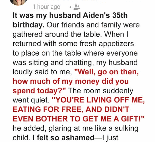 The illusion shattered completely at Aidan’s 35th birthday dinner. The house buzzed with family and friends, a picture of happy chaos. Lacey had spent the entire day meticulously preparing an elaborate spread of appetizers. As she entered the living room, balancing a platter, Aidan’s voice cut through the air, dry and amplified, announcing, “Well, go on then, Lacey. How much of my money did you spend on today?” Laughter died, conversations halted, and an uncomfortable silence descended. He continued, sipping his drink with a smug air, “You’re living off me, eating for free, and didn’t even bother to get me a gift. You’re not even pregnant. It’s like you don’t even want a baby.”