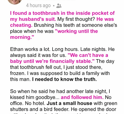 A woman recounts finding a toothbrush with dried toothpaste in her husband Ethan’s suit pocket, immediately suspecting infidelity. Despite his predictable “business trips” and seemingly cold, routine affection, her intuition screamed something was wrong. After he left for his next trip, she secretly followed him, expecting to find another woman.